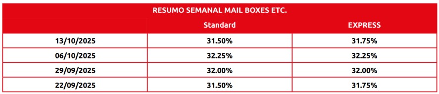 O suplemento de combustível MBE é actualizado semanalmente com base nos suplementos das principais empresas de entregas expresso / courier e em função da cotação semanal dos preços do barril de petróleo cotado na bolsa de Londres (Brent Crude Oil), de acordo com as informações do Fundo Monetário Internacional (IMF).